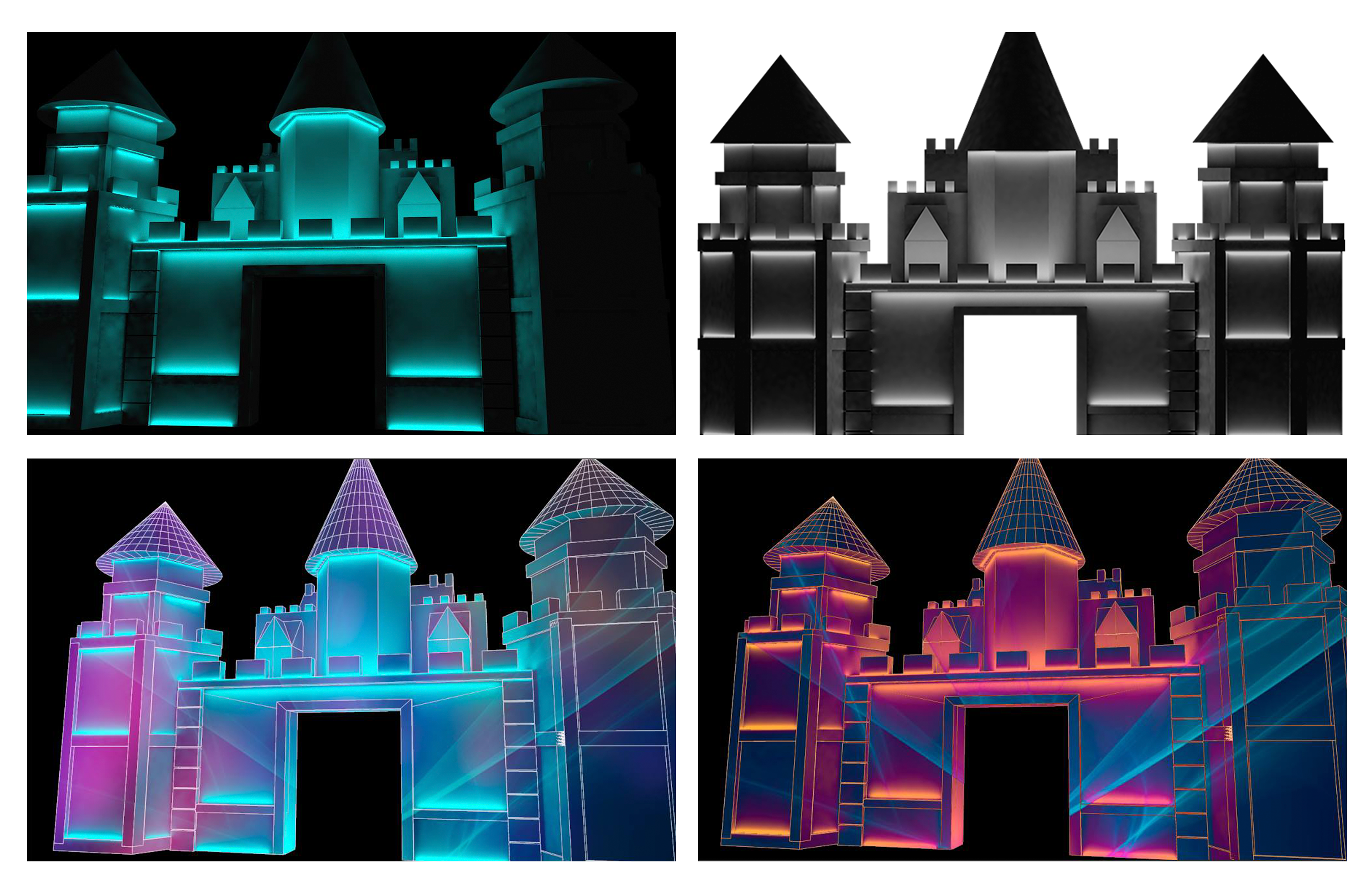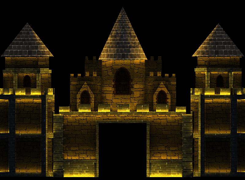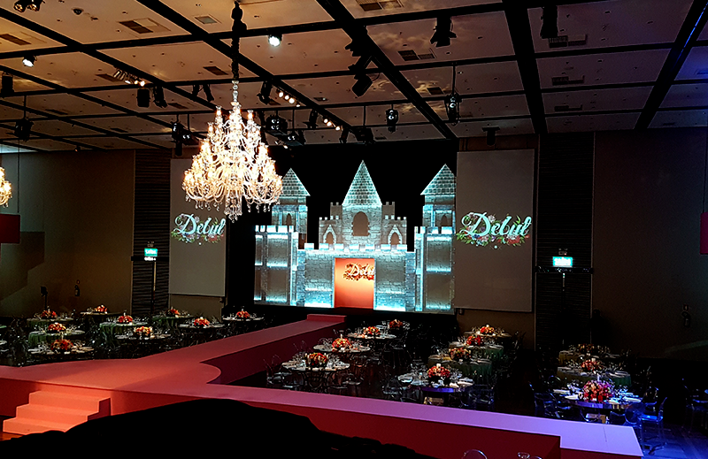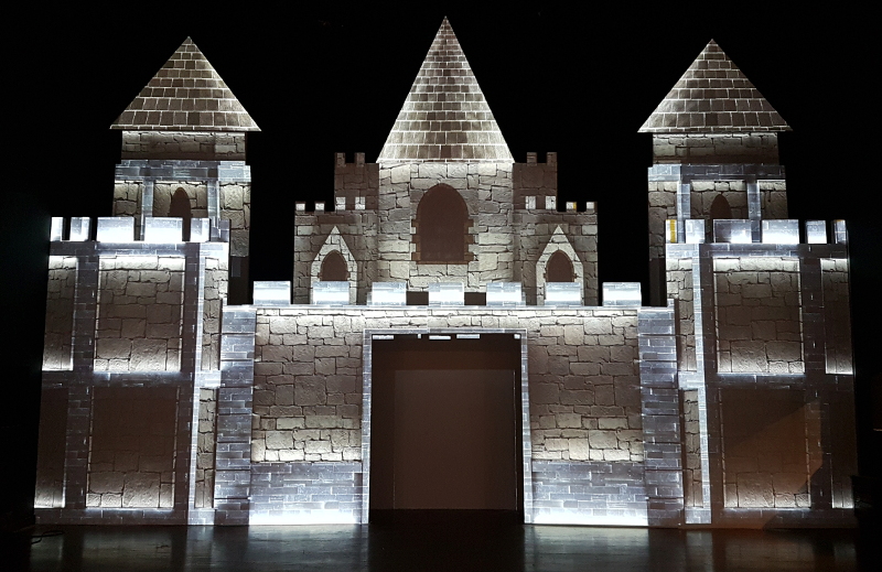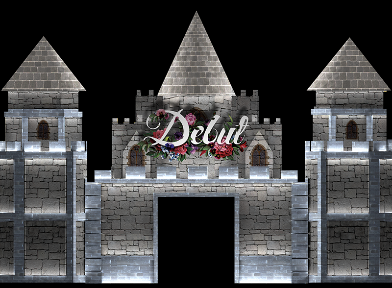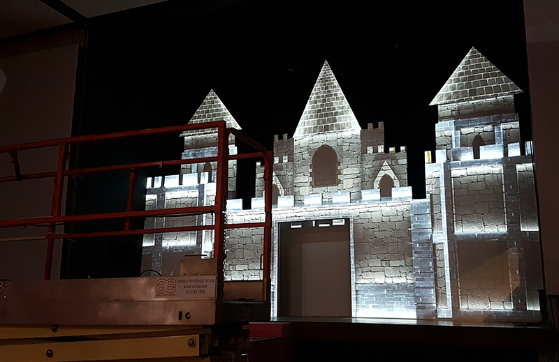 Projeção mapeada em formato de castelo para evento de debutantes da Casa NTX em Porto Alegre.